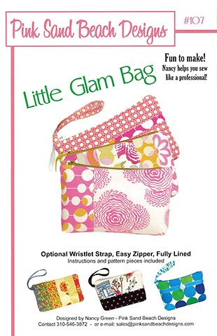 Great class project for beginners. Learn to sew a zipper that is easy and professional-looking. Can be made with jelly roll strips, or fabric pieces. Optional wrist strap; fully lined.Pink Sand Beach Designs - Little Glam Bag Specifications